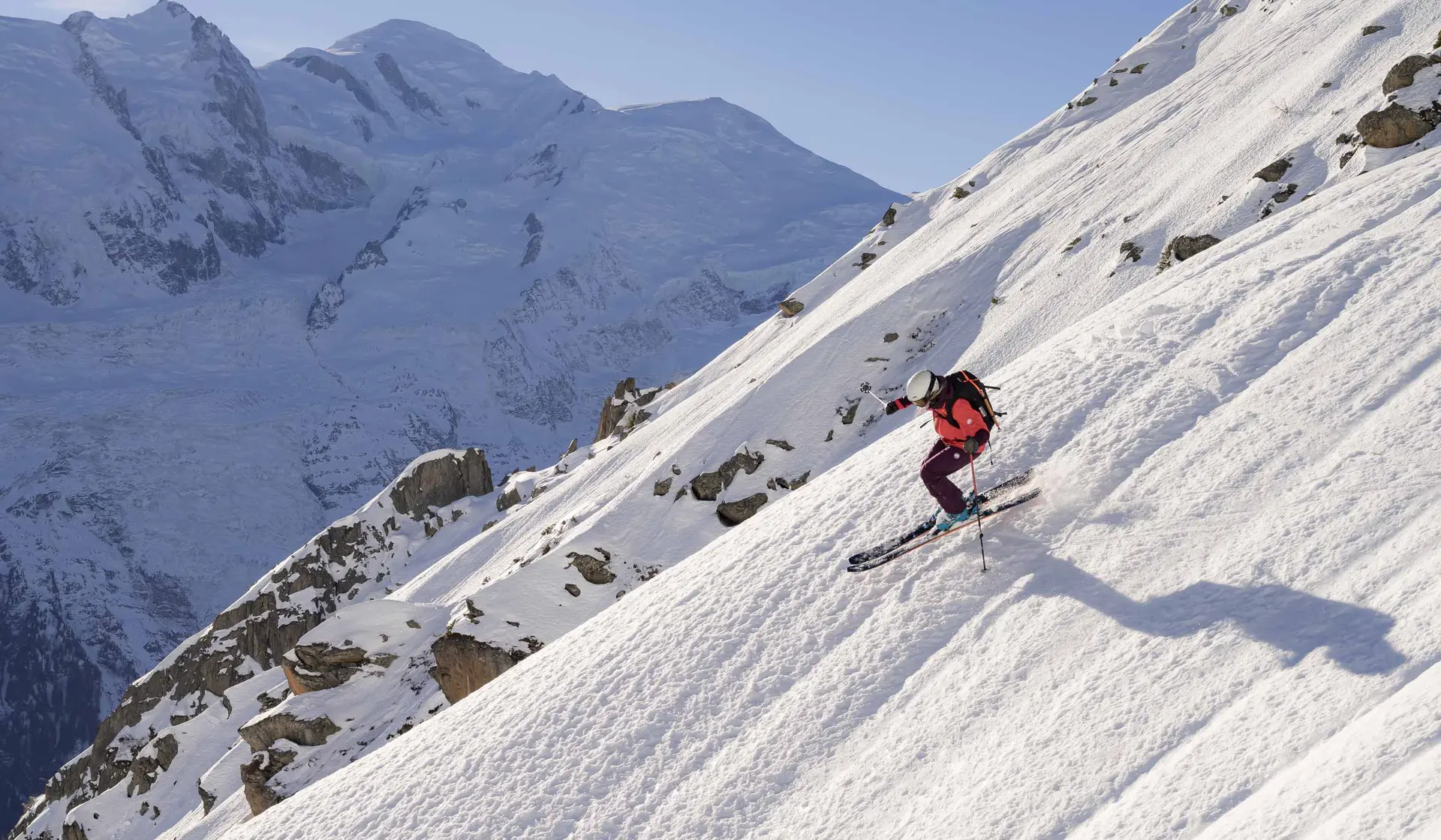 The cable car to the top of the Brévent rises from almost the literal centre of Chamonix. In the depths of the valley, the sun barely reaches the shady streets in the middle of winter, but as the cable car climbs, bright sunlight reflects off snowy slopes and illuminates iridescent glaciers. Directly opposite the Brévent stands the spires and minarets of the Aiguille du Midi and countless other peaks below the dome of Mont Blanc. Each and every piece of rock has been climbed and named, every tongue of snow skied.