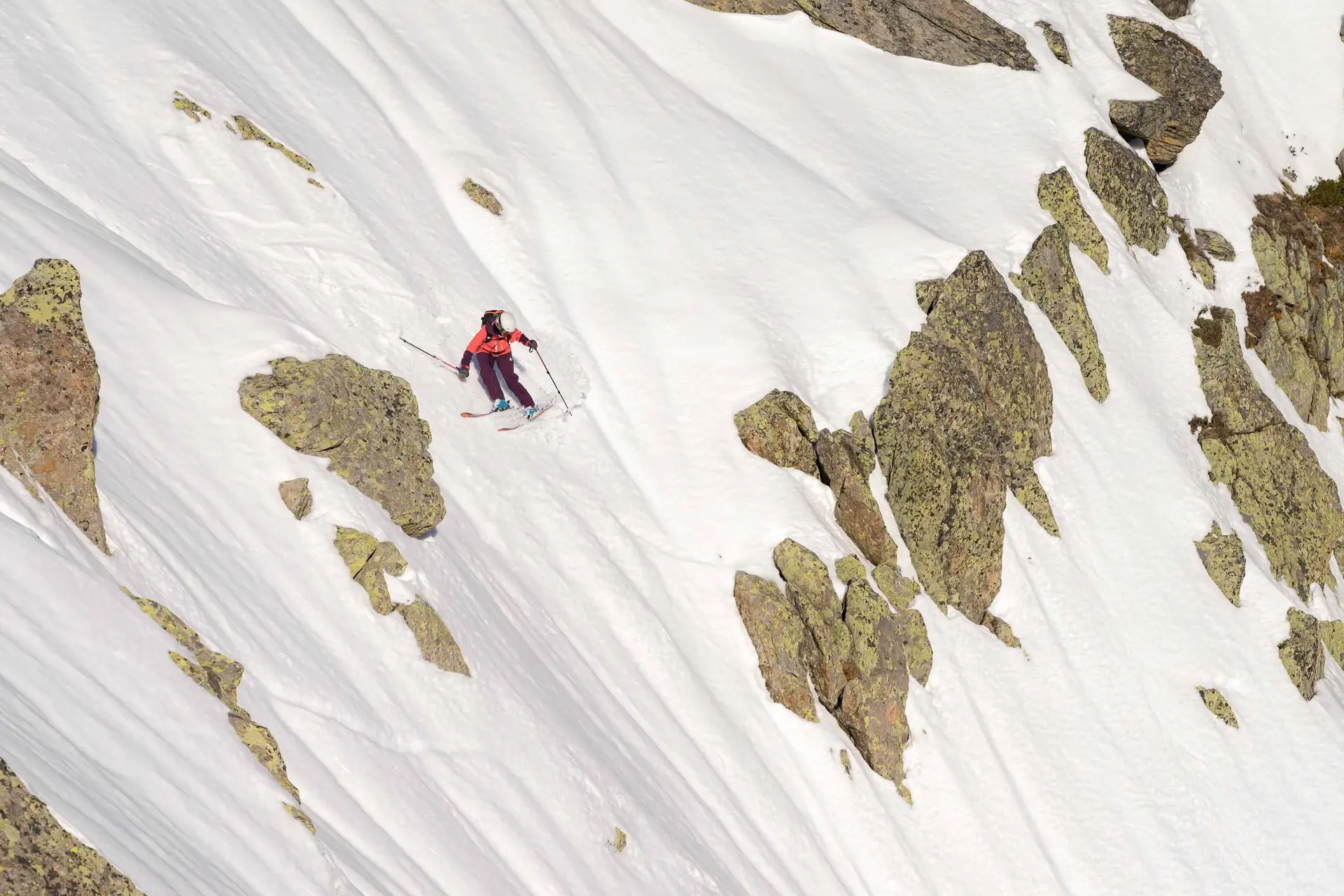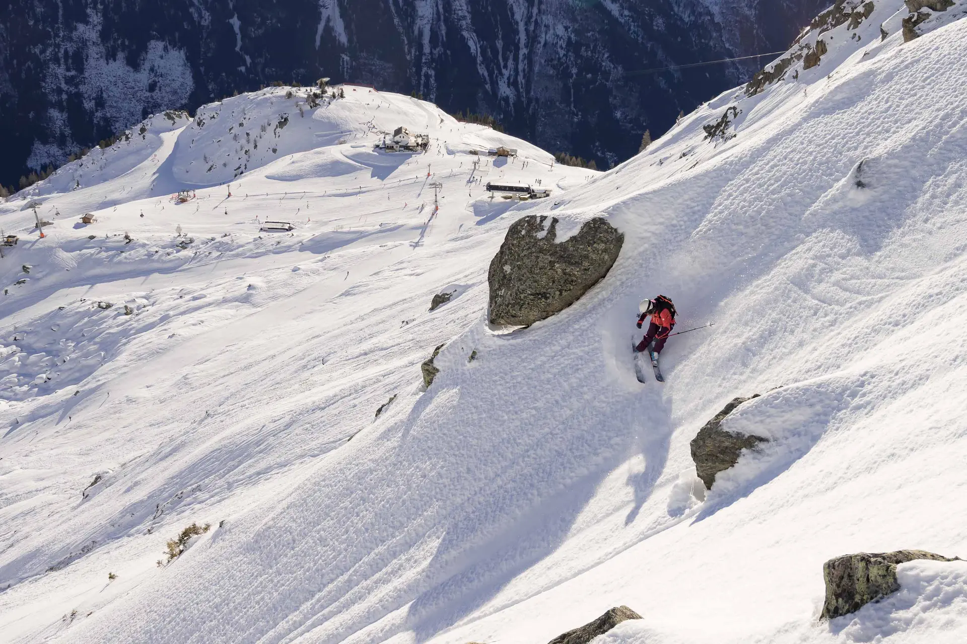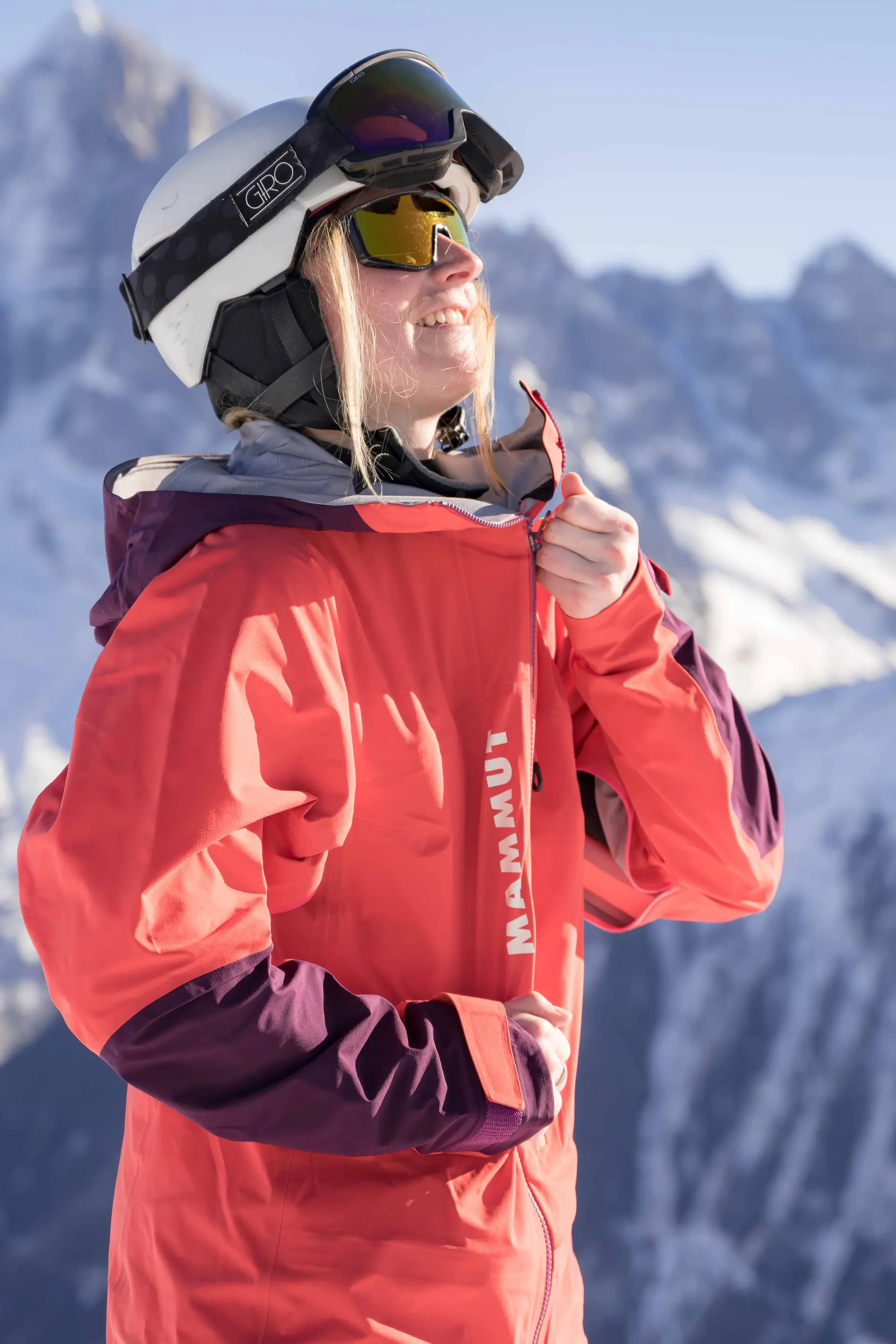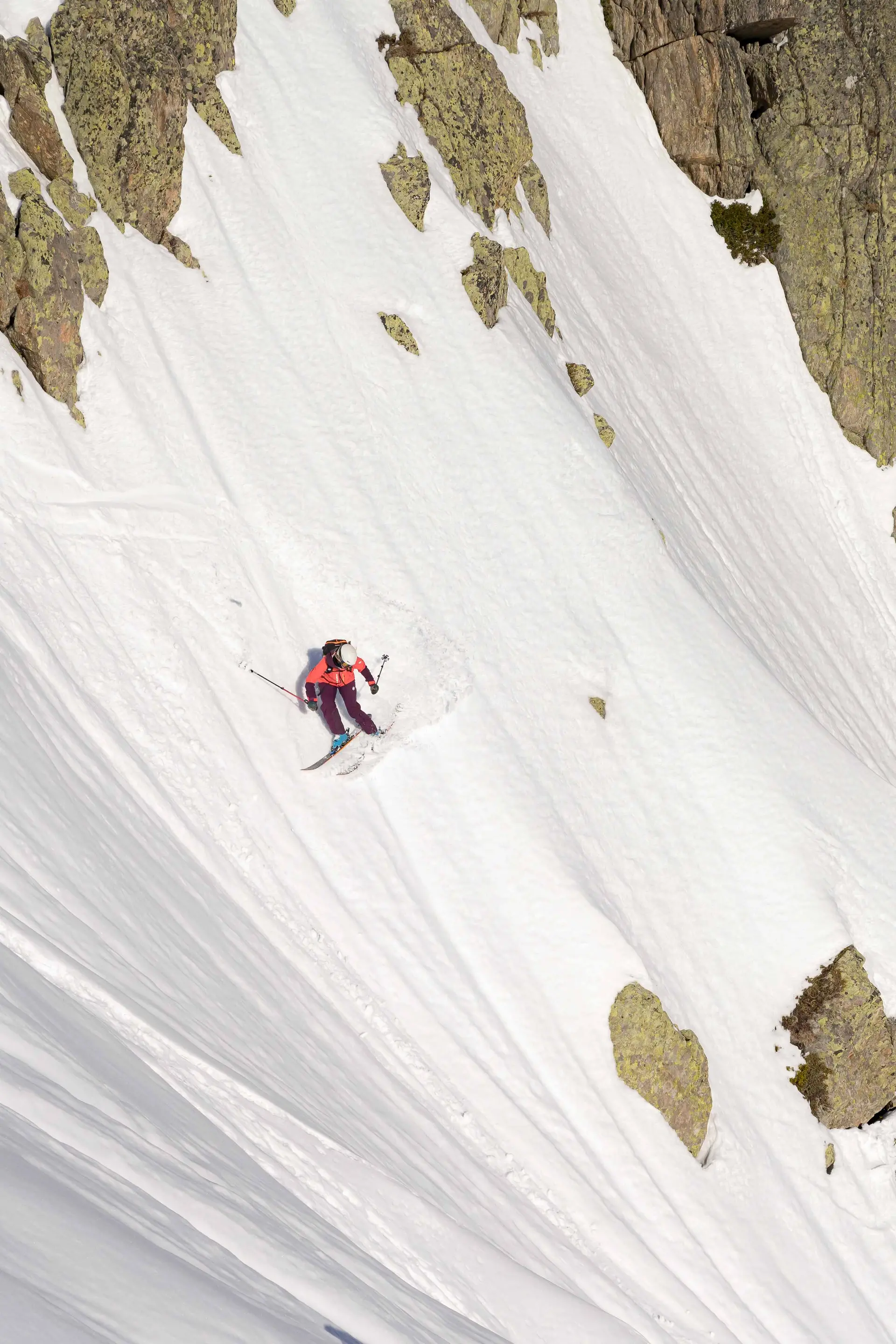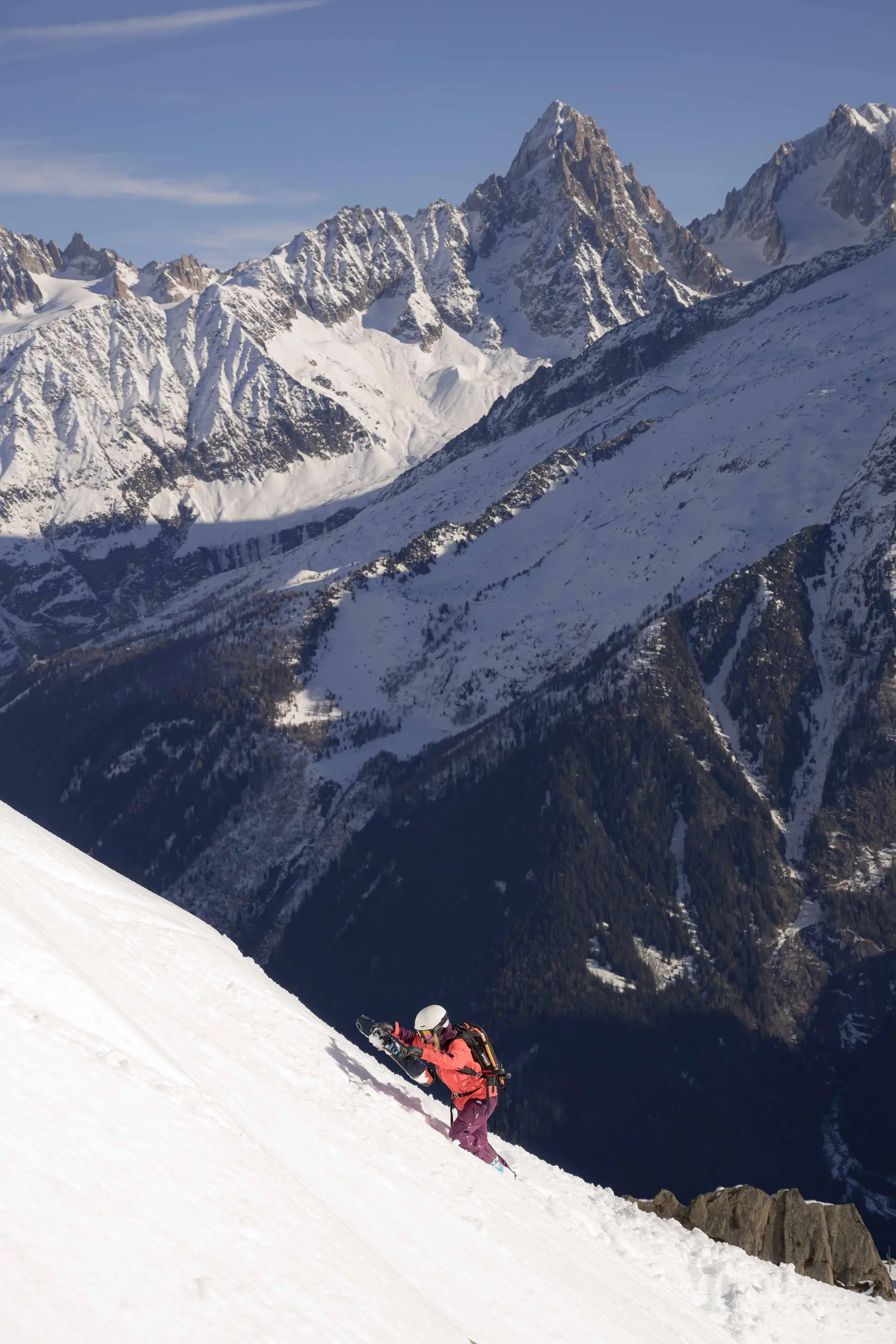 Within minutes of leaving behind the bars and ski shops of the town centre Lucie Pendered-Mazer spends a few moments surveying her virtual backyard from the top of the lift. The January sun throws little warmth, so before long she drops into the side country away from the pistes, threading her way between exposed rock, flowing effortlessly down the mountain, lost in pure play.