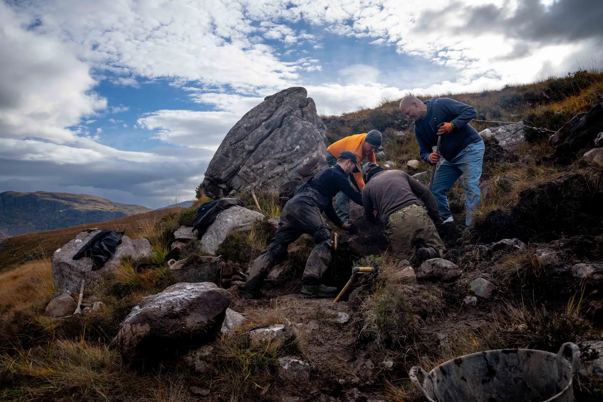 Dwarfed by the surrounding landscape, a small team works all day to shape a few square metres of that land. They excavate, secure and lever. They hammer and haul. Progress is measured in hours, days and weeks rather than minutes, but their impact should last years; mountain time as Ewan calls it. This group’s work represents the future, however. A mixture of full-time contractors and volunteers working alongside each other; building a path that will eventually blend in with the mountain; sourcing aggregate material from the site and working path edges to encourage the regeneration of native vegetation.