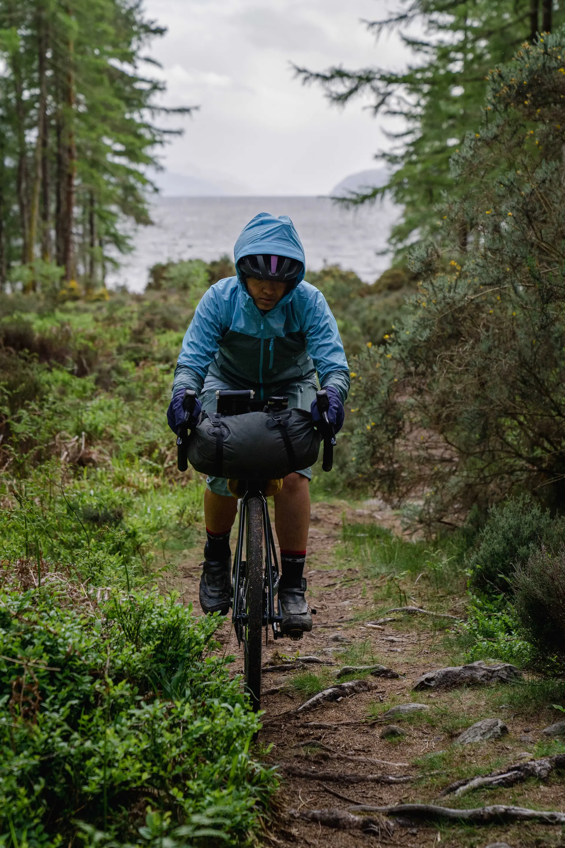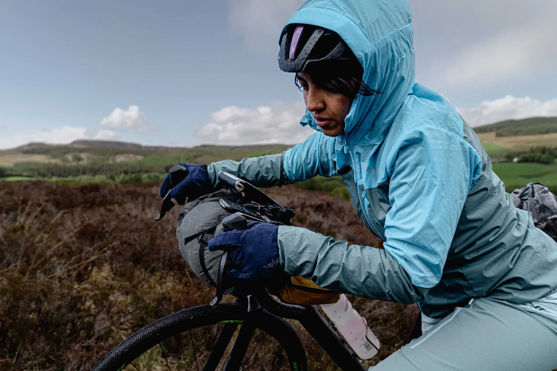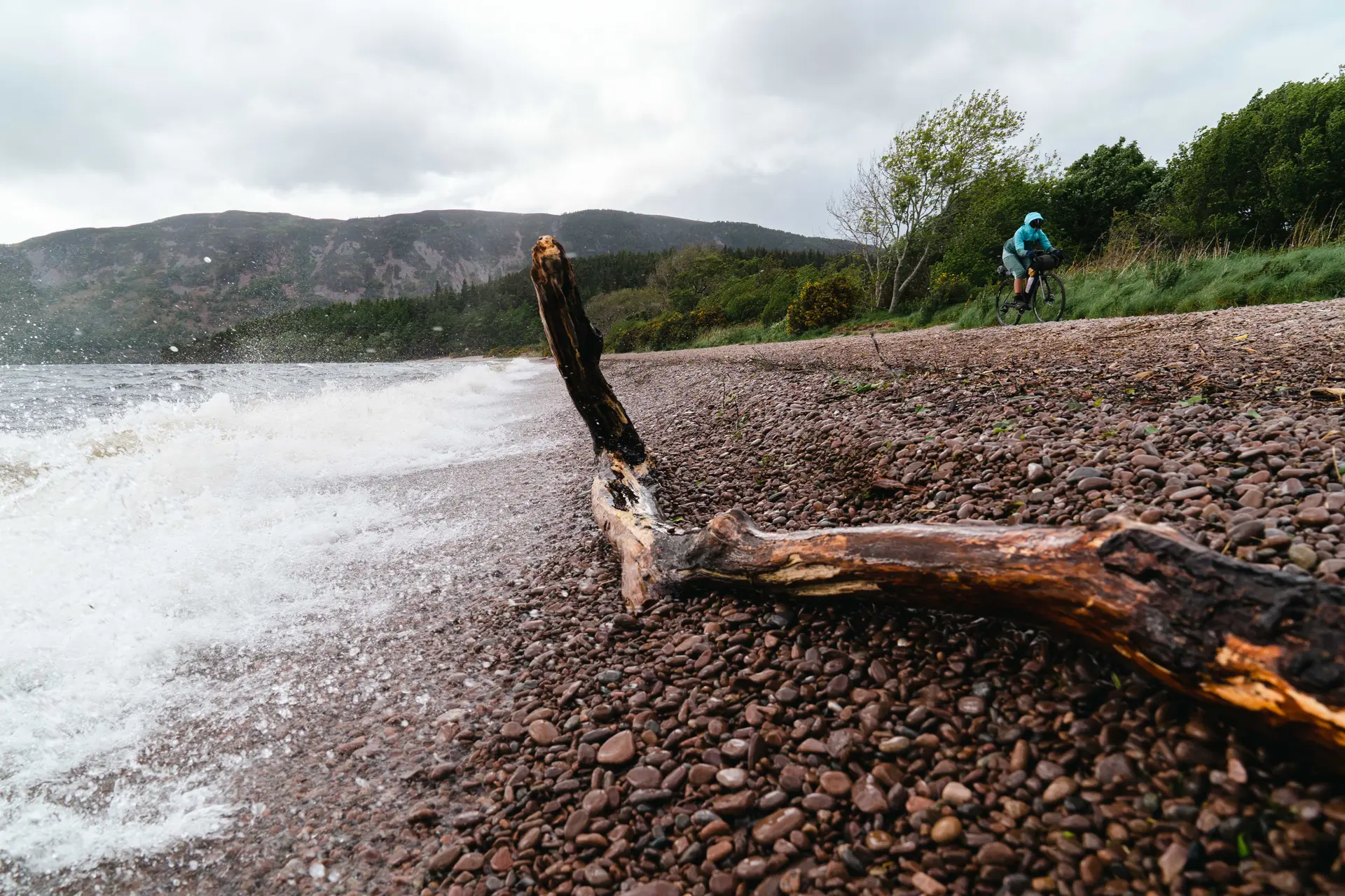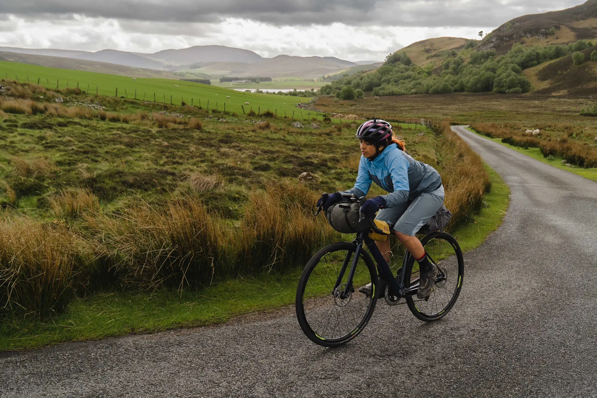 Call over, but with hours of daylight left, Kulkarni grabs her gravel bike and loads it up with a minimal overnight setup. Stuffed inside a bar-roll and saddle pack is a bivvy bag, sleeping bag and mat; and a little food. Heading south-west of Inverness, she dives onto deserted singletrack roads at the earliest opportunity, tugging her jacket hood over her helmet as squalls of rain blow up the Great Glen. Rolling along the eastern shores of Loch Ness, wind-driven waves crash against the pebble beach. With little protection from the elements on offer, Vedangi heads inland and climbs to the smaller Loch Ruthven. Occasionally the sun breaks through the overcast sky, illuminating rain drops like jewels. Patches of woodland are interspersed with open moor. Tracks so thin that they are almost entirely obscured by heather lead their way past a large boulder; the perfect shelter from the prevailing storm.