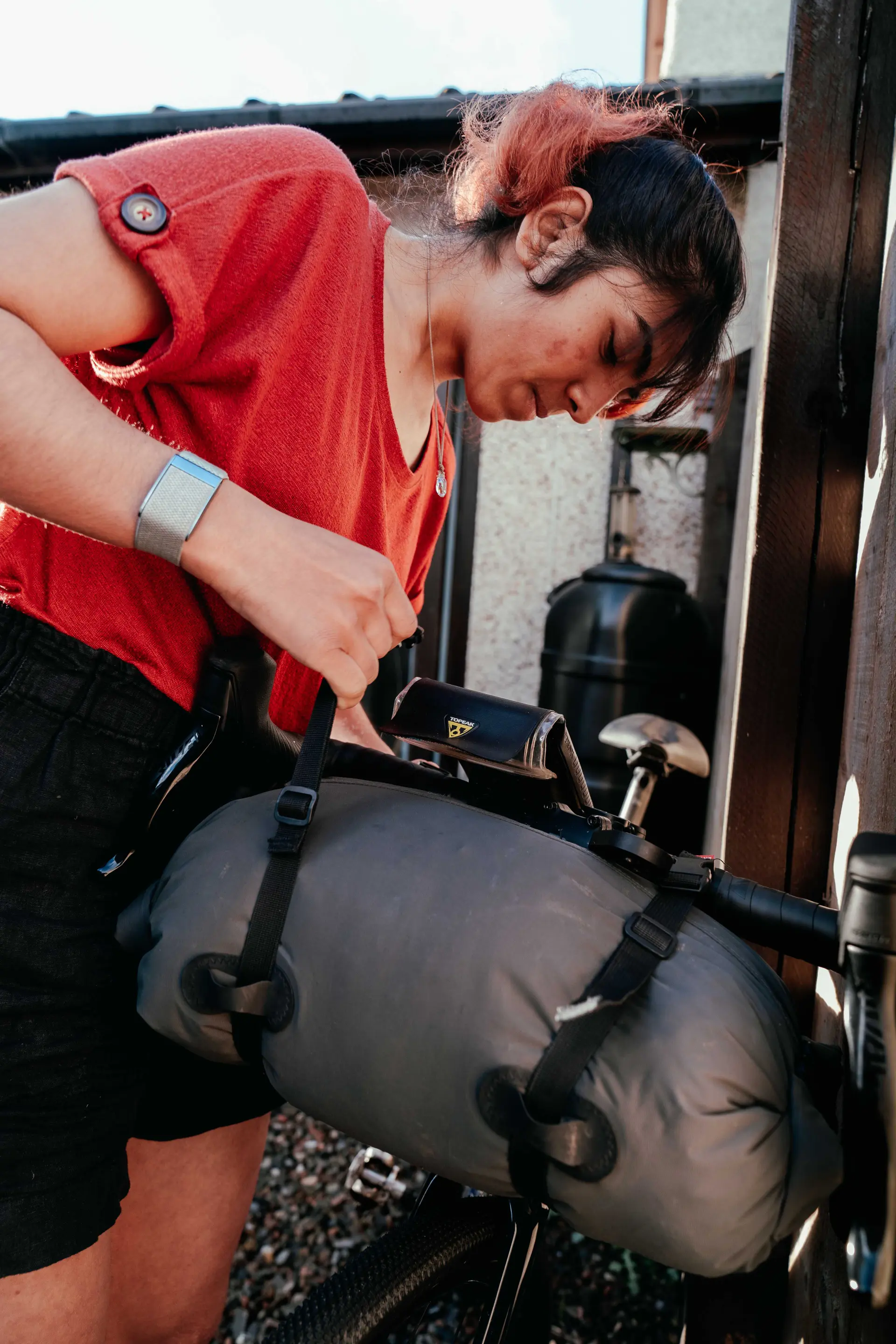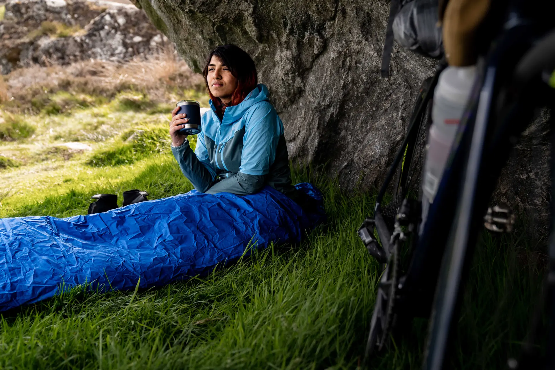 Vedangi rolls out her sleeping bag and climbs in as a watery sunset casts warm light across the rolling moors. With her back rested against the boulder she sips at a warm drink and looks out at wind-driven clouds racing across the sky. Her bike is propped up next to her, ready to go when she is, which – knowing Kulkarni – will be soon.