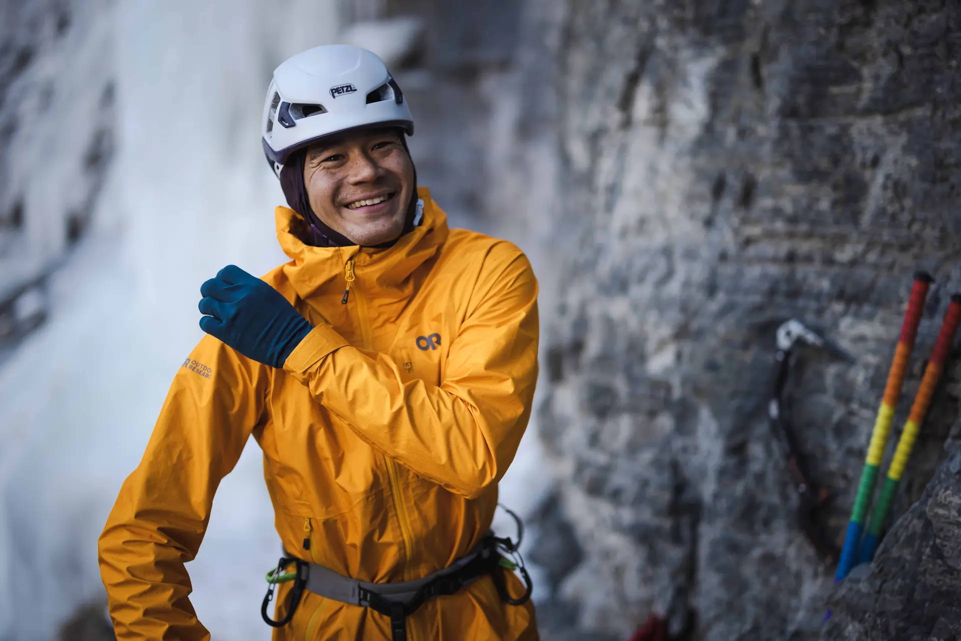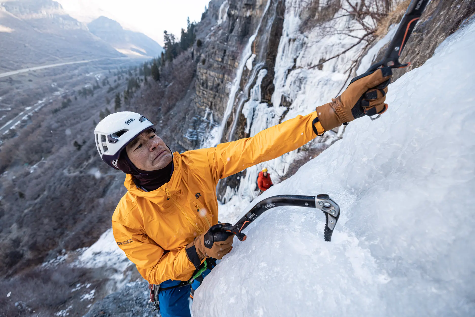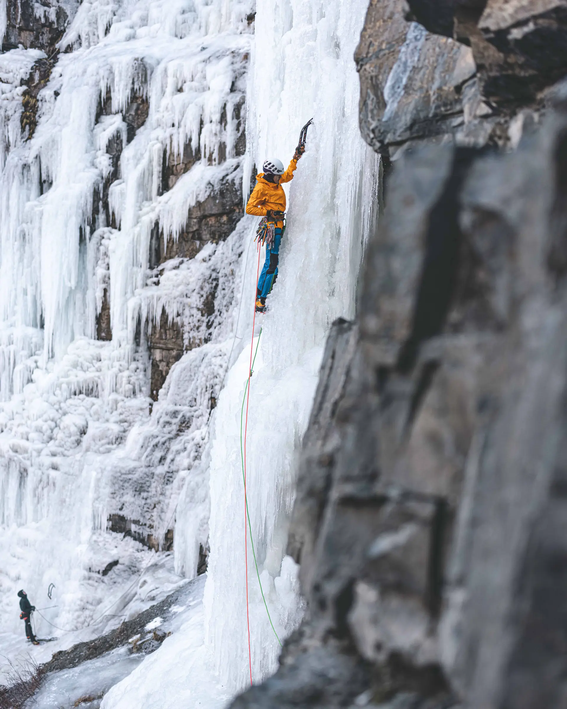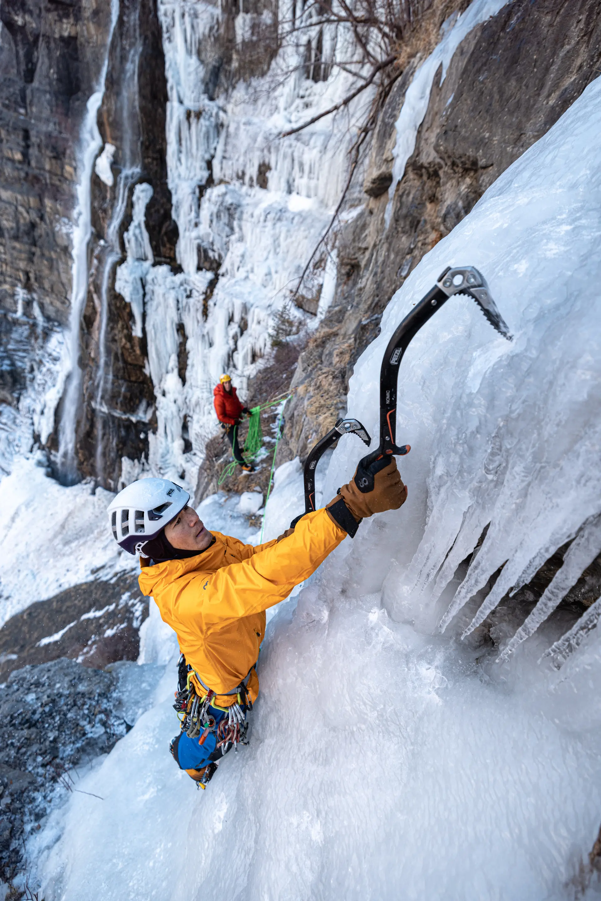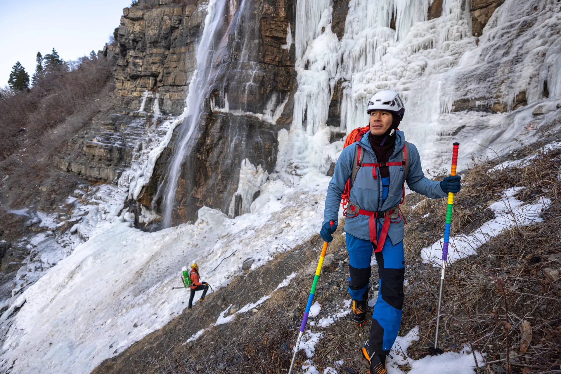 Arriving at the base of the route, Bukowski puts his rainbow trekking poles to one side. He pulls the hood of his mid layer over his bleach-blonde hair and puts on his helmet before racking ice screws and quickdraws to his harness. The frigid scene belies the relatively mild conditions and the poor state of the ice.