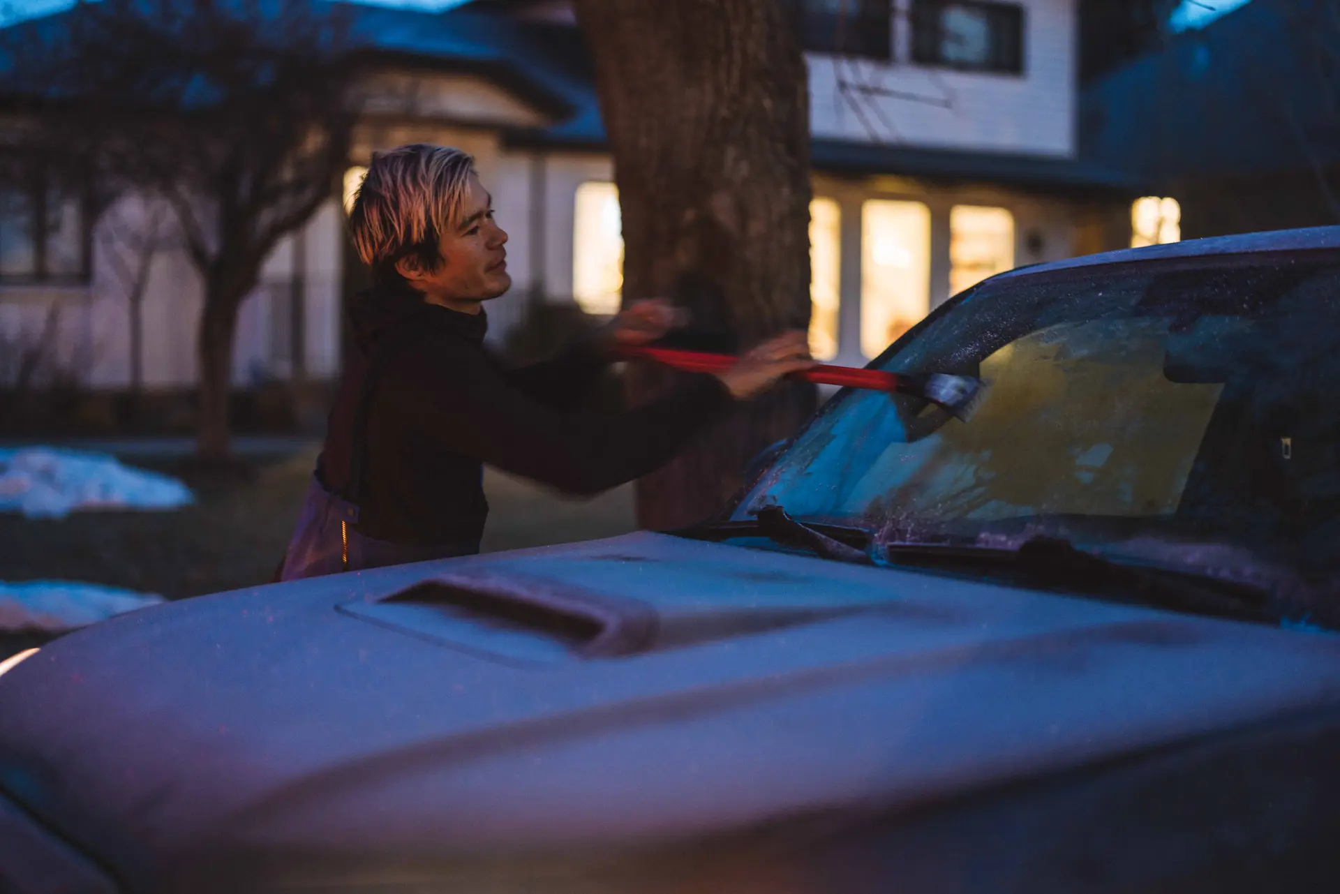 A couple of weeks later and Bukowski is once again scraping the ice from the windshield of the van that he calls home. This time it’s in the early morning half-light of a January day in Utah. The sky is only just beginning to lose it’s inky blackness, pastel oranges beginning to creep into the indigo.